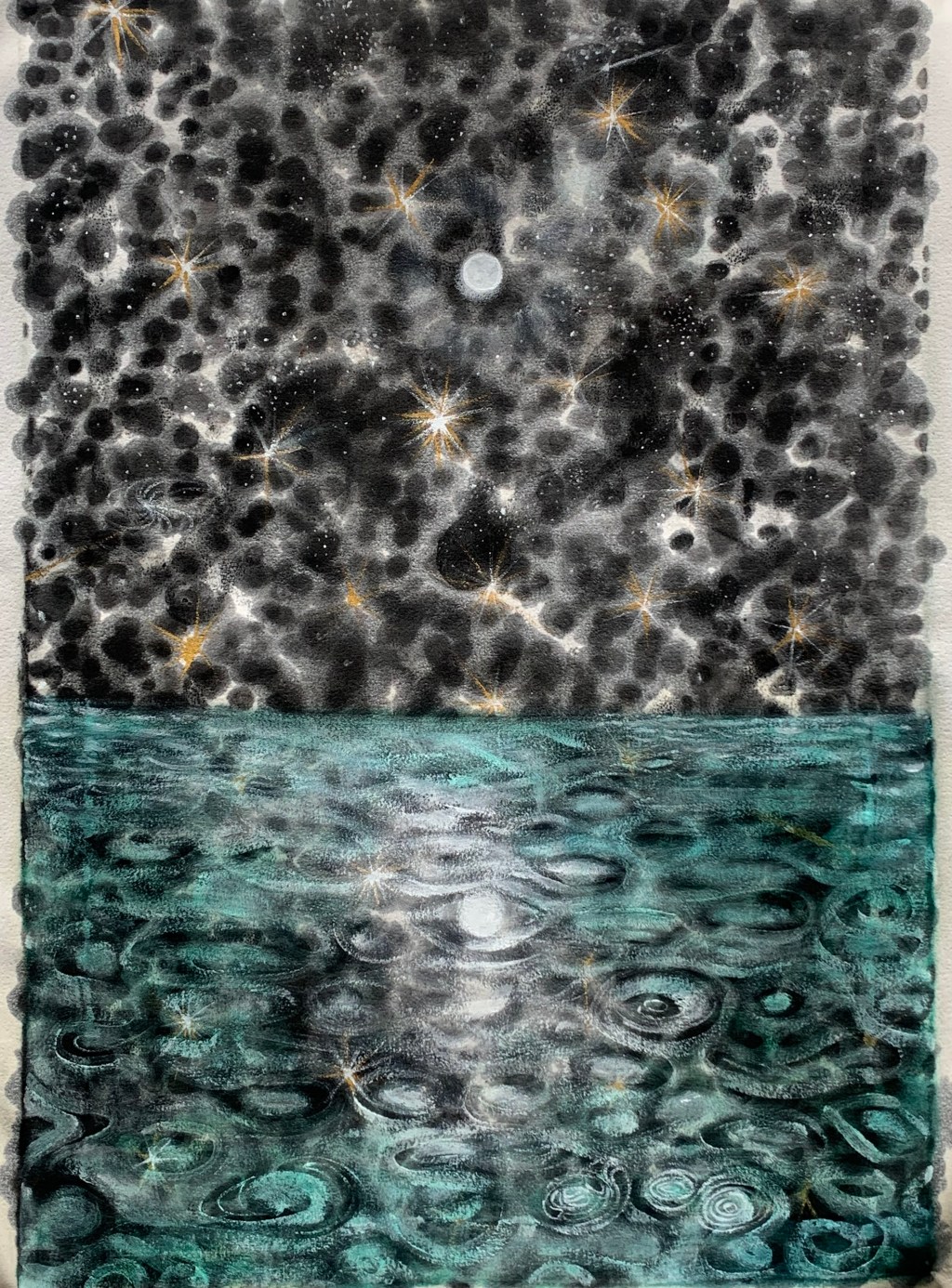 This painting was the first canvas I ever stretched. It start off as an experimentation with plant dyes as I made a beet juice solution. I soaked my socks in it and danced on the blanket in a park. I proceeded to dip my toes in ink and make dots across the canvas. It wasn’t light-fast so the beet juice faded. During a grieving period, I began to paint my memories with the moon I had made the previous summer. They included a super moon, stars so bright the stars reflected in the water (that I later jumped into from a 30 ft high bridge) and then following a super blood moon down a highway on my journey home.