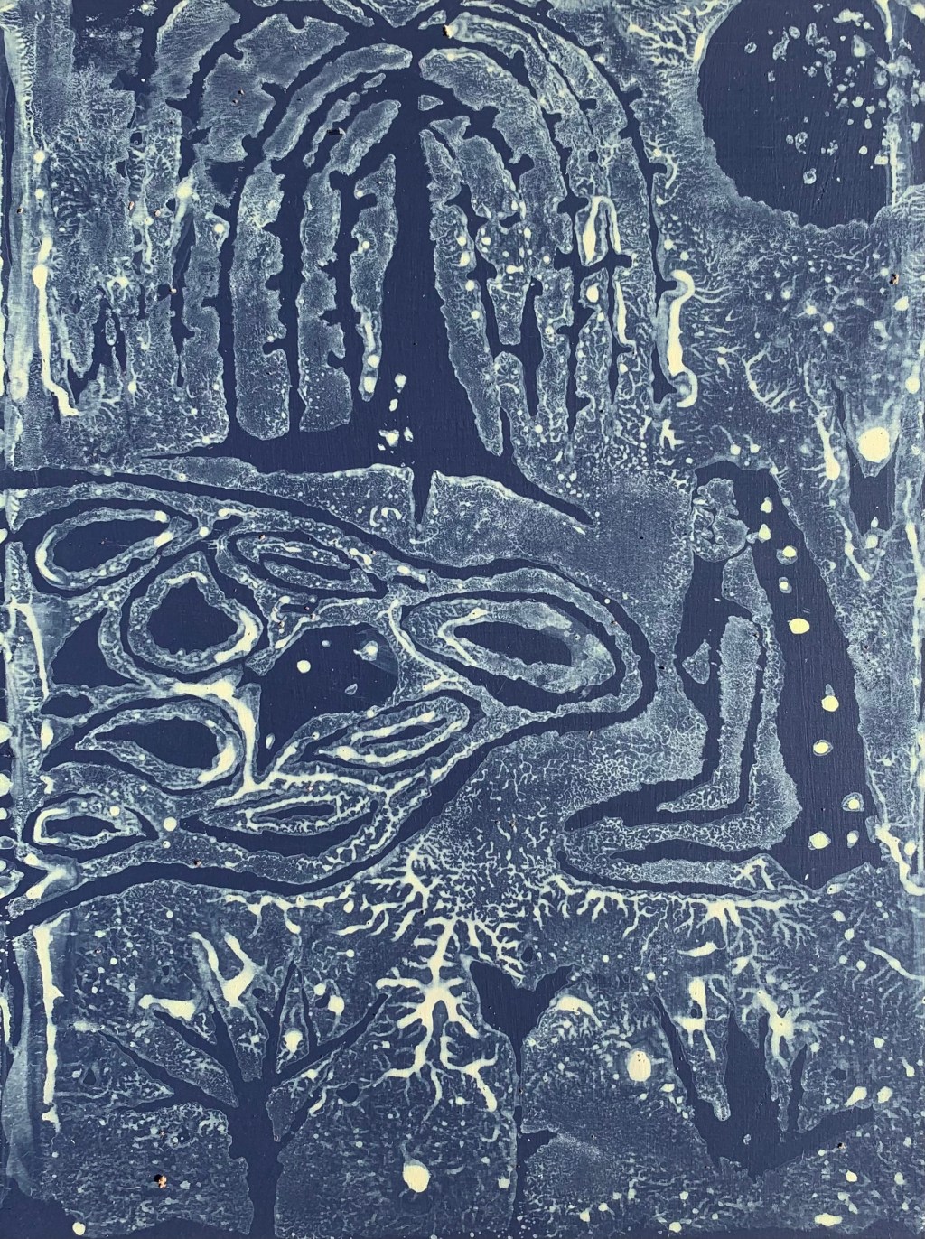Connecting, 2023 (15 cm x 35 cm) Corkboarrd relief print with house paint and water on plywood